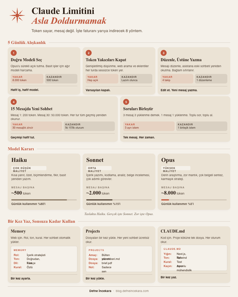 Ben bu yazıyı hazırlarken de aynı kuralları uyguladım: Haiku’da taslak, Sonnet’te düzenleme, Opus yalnızca yapısal karar için. Toplam token tüketimi: Eski alışkanlıklarımın yaklaşık dörtte biri.