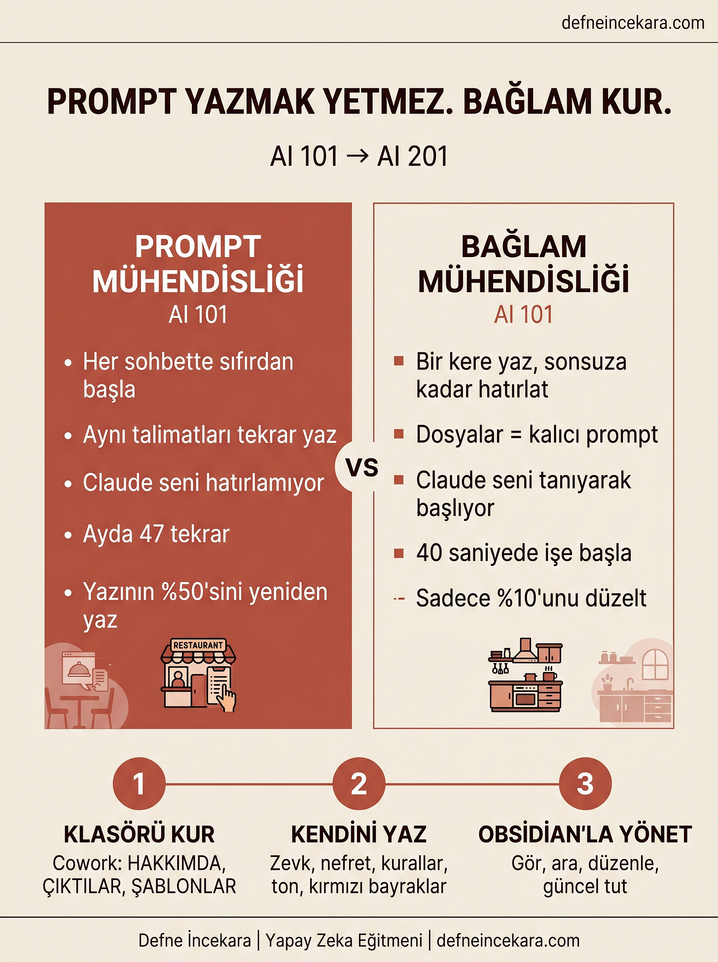 Bağlam mühendisliğinin gerçek zorluğu burada: kendini metin dosyasına dökecek kadar iyi tanıman gerekiyor. Bu da bir koçluk egzersizi aslında. Yapay zekayı eğitmek için önce kendini eğitmen lazım.
